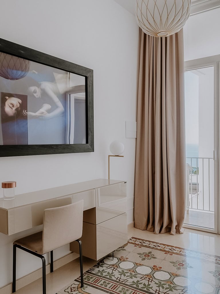 The essence of contemporary luxury on Capri in a sophisticated, minimalist room. A rejuvenating space away from the hustle and bustle, where every element is selected with a gallery eye. Enjoy discovering the Liquid Art System artists who make this room a work in itself.